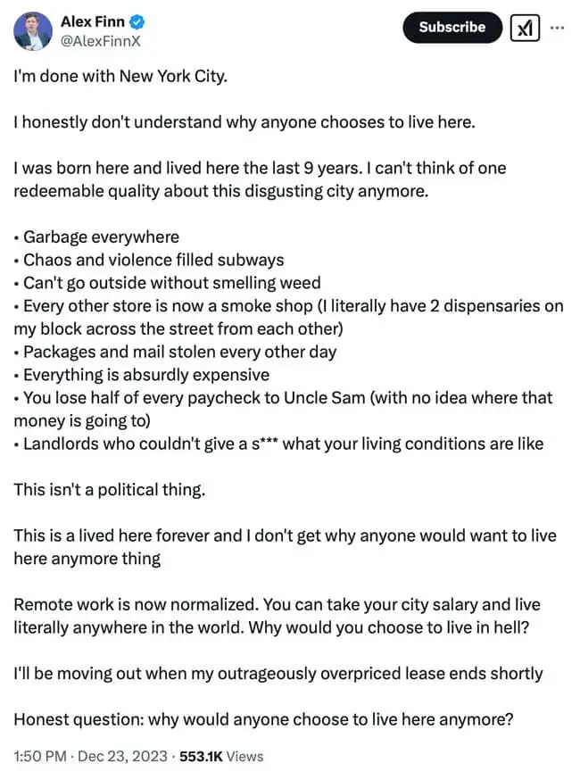 "New York City has decided to destroy itself" (The Telegraph, 18 July 2023)
